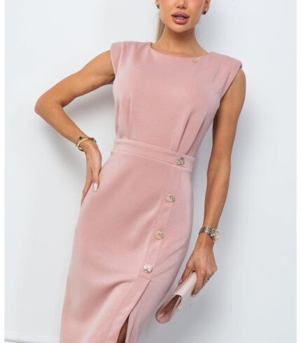 Tökéletes választás akár mindennapi, vagy alkalmi viseletre. A Mystic Day ruha anyaga 67% pamut és 33% poliészter. Világos púder színű , kerek nyakkivágás , rövid ujjal , arany gomb díszítéssel