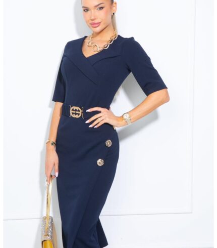 Tökéletes választás akár mindennapi, vagy alkalmi viseletre. A Mystic Day ruha anyaga 67% pamut és 33% poliészter. Sötétkék színű , kerek nyakkivágás , rövid ujjal , arany gomb díszítéssel ,