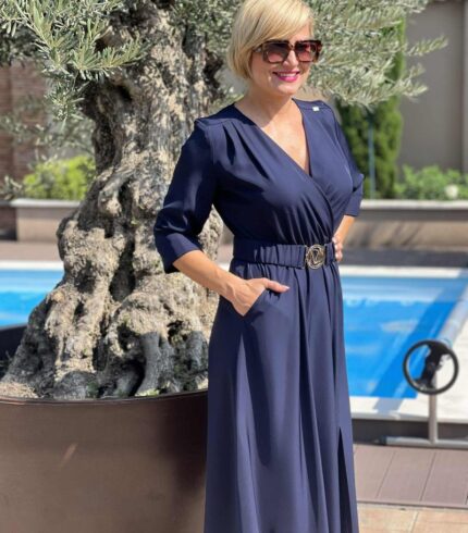 Tökéletes választás akár mindennapi, vagy alkalmi viseletre. A Mystic Day ruha anyaga 67% pamut és 33% poliészter. Sötétkék színű , felső része : rövid ujjú , V kivágású , átlapolt