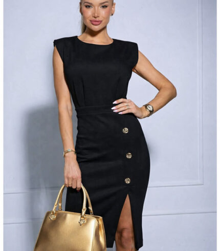 Tökéletes választás akár mindennapi, vagy alkalmi viseletre. A Mystic Day ruha anyaga 67% pamut és 33% poliészter. Színe fekete , kerek kivágott , elől arany csatt díszíti , elasztikus anyag