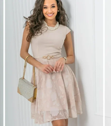 Tökéletes választás akár mindennapi, vagy alkalmi viseletre. A Mystic Day ruha anyaga 67% pamut és 33% poliészter. Bézs színű , rövid ujjú , egyszínű felsőrész , csipke magába nyomott mintás