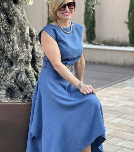 Tökéletes választás akár mindennapi, vagy alkalmi viseletre. A Mystic Day ruha anyaga 67% pamut és 33% poliészter. Színe farmerkék , csónak nyakú , ejtett vállú , térd alatti ,asszimetrikus szoknya
