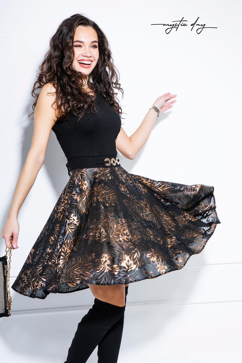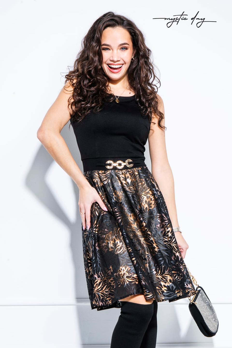 Tökéletes választás akár mindennapi, vagy alkalmi viseletre. A Mystic Day ruha anyaga 67% pamut és 33% poliészter. Felső része ujjatlan ,kerek nyakrész , fekete színű , rugalmas anyag , derékrész csatt díszítéssel , deréktól lefele bővül , fekete -arany mintázattal , térd feletti . Rendeld házhoz Mystic Day Kecskemét webáruházunkból. Rendelésnél a megjegyzés rovatban érdemes mell-derék-csípő bőséget írni, hogy a megfelelő méretet tudjuk küldeni.