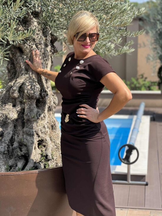 Tökéletes választás akár mindennapi, vagy alkalmi viseletre. A Mystic Day ruha anyaga 67% pamut és 33% poliészter. Csokiszínű színű , hasnál húzott , hastakarós , derékrésznél varrott övvel , aranya dísszel , asszimetrikus szoknya résszel , kerek nyakkal , négy gomb díszítéssel , ejtett vállal . Rugalmas anyag .Rendeld házhoz Mystic Day Kecskemét webáruházunkból. Rendelésnél a megjegyzés rovatban érdemes mell-derék-csípő bőséget írni, hogy a megfelelő méretet tudjuk küldeni.