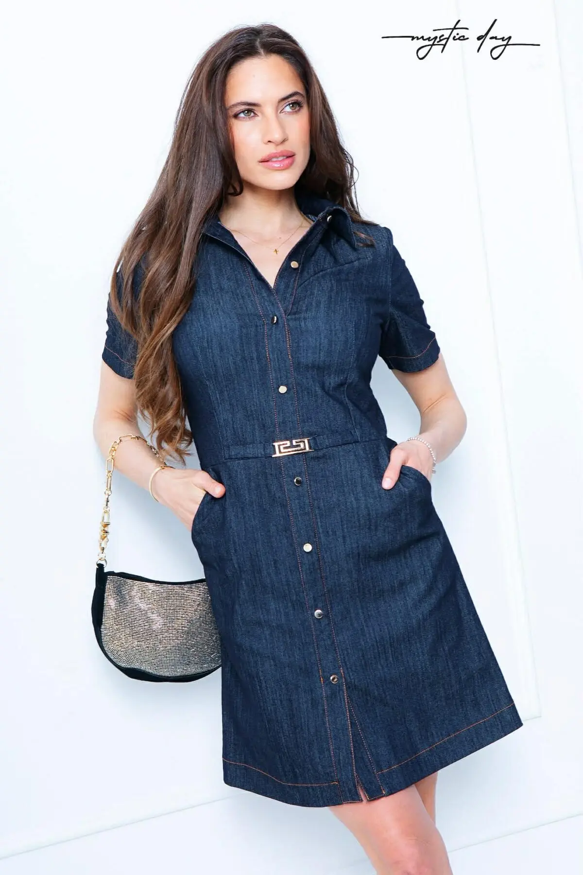 Tökéletes választás akár mindennapi, vagy alkalmi viseletre. A Mystic Day ruha anyaga 67% pamut és 33% poliészter. Farmer hatású , felső része gombos kialakítás , oldalt cipzáras , rövidujjú , galléros nyakrész , deréknál dísz övcsat , enyhén A vonalú , elasztikus , oldalt cipzáras.