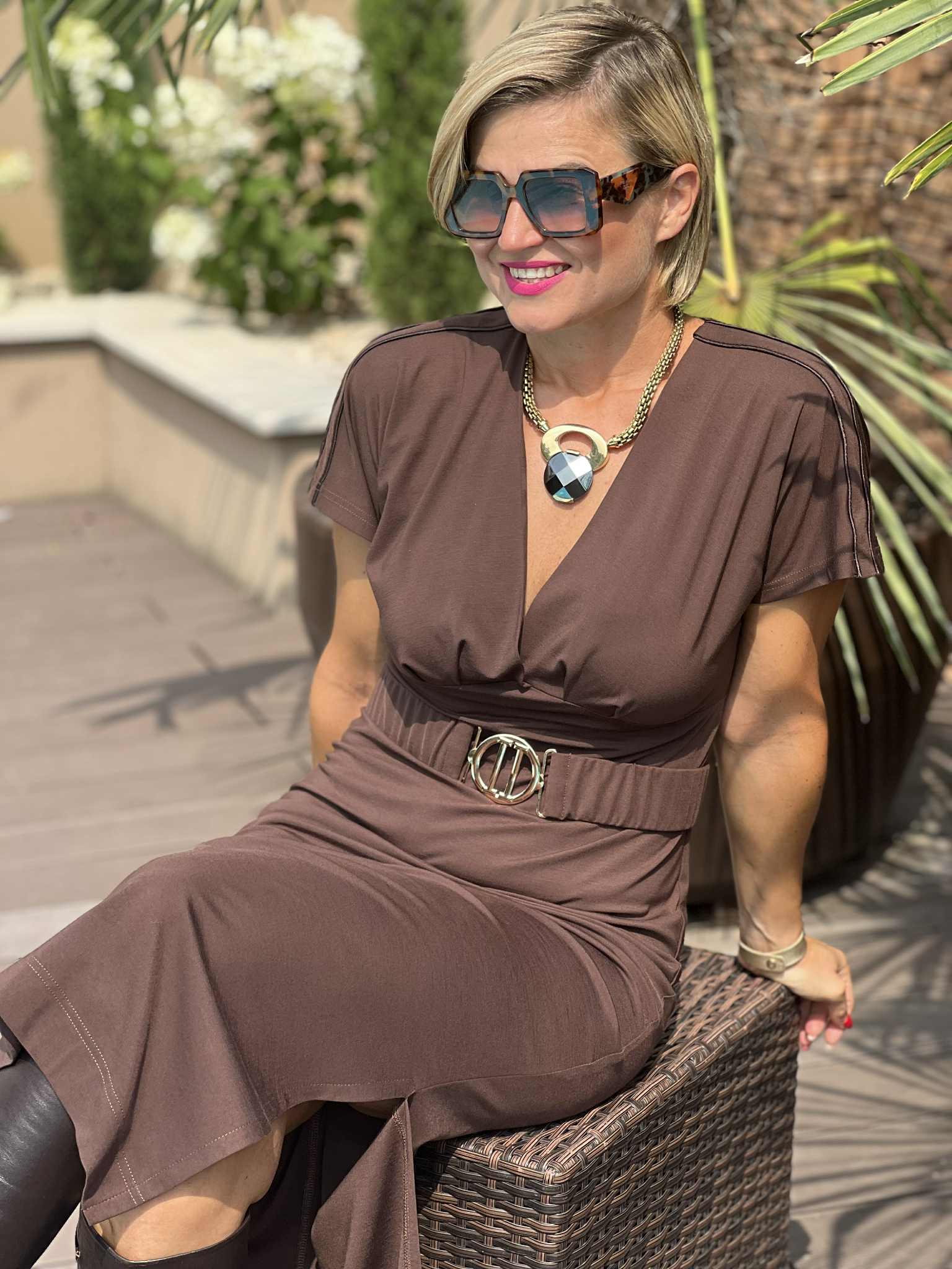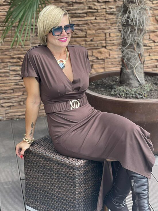 Tökéletes választás akár mindennapi, vagy alkalmi viseletre. A Mystic Day ruha anyaga 67% pamut és 33% poliészter. Csokibarna színű , térd alá érő , egyenes fazon , V kivágással , ejtett rövid ujjal , rugalmas anyag . Saját anyagából öv jár hozzá ! Rendeld házhoz Mystic Day Kecskemét webáruházunkból. Rendelésnél a megjegyzés rovatban érdemes mell-derék-csipő bőséget írni, hogy a megfelelő méretet tudjuk küldeni.