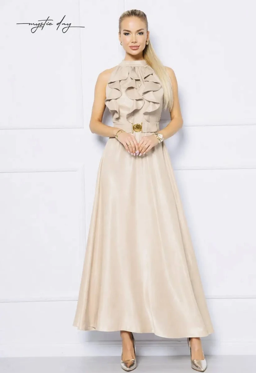 Tökéletes választás akár mindennapi, vagy alkalmi viseletre. A Mystic Day ruha anyaga 67% pamut és 33% poliészter. Pezsgő színű ,enyhe csillogós , fodros nyakrész , ujjatlan , deréktól bővülő , hosszú ruha + boleró . Saját anyagból gumis öv tartozéka . Nem rugalmas anyag . Rendeld házhoz Mystic Day Kecskemét webáruházunkból. Rendelésnél a megjegyzés rovatban érdemes mell-derék-csípő bőséget írni, hogy a megfelelő méretet tudjuk küldeni.
