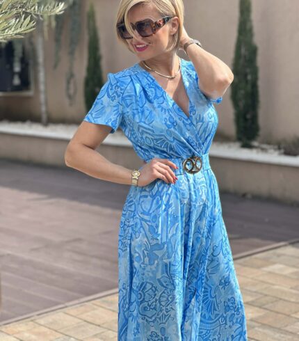 Tökéletes választás akár mindennapi, vagy alkalmi viseletre. A Mystic Day ruha anyaga 67% pamut és 33% poliészter. Kék mintás , átlapolt V kivágású , könnyed esésű , 3/4 -es ujjú