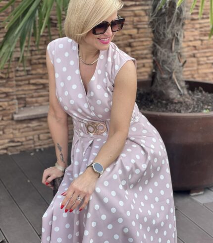 Tökéletes választás akár mindennapi, vagy alkalmi viseletre. A Mystic Day ruha anyaga 67% pamut és 33% poliészter. Bézs alapon fehér pöttyök , átlapolt mellrész , ujjatlan , térd alá érő